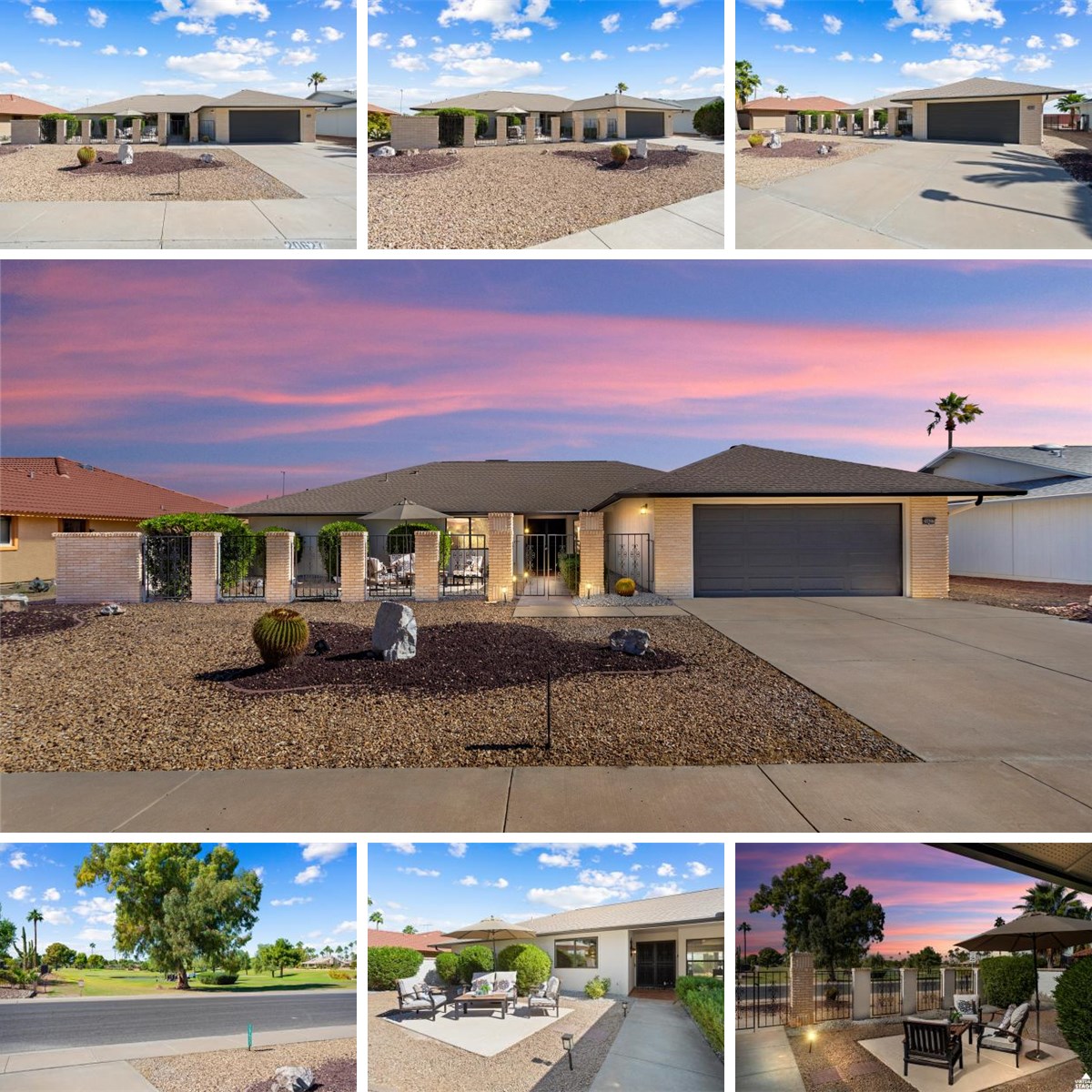 Reimagined Beauty & Golf Course Views in the 1st Series of homes built by Del Webb in Sun City West. This Ranch home has a larger lot with multiple flex-spaces throughout home. This home has been tastefully renovated and conveniently located across from Stardust Golf Course 17th hole and water Views from your entertaining gated front courtyard. This is one of the largest floorplans in this Series called the Augusta H769 Expanded. You will enjoy entertaining with re-invented interior charm. Double door grand entry, smooth surface plank vinyl flooring throughout accompanied by 3' baseboards, recessed lighting & new windows. Cool designer colors throughout with TV wall with clever wood designed wall with 2 oversized sliding doors. Ceiling fans throughout. Flex-space off of Great Room has been designed as a reading, game and relaxing area. Kitchen has been redesigned with splashy elegance including breakfast bar, breakfast nook, WINE Fridge, multiple counter space, cabinets and drawers in addition to upscale appliances & beverage refrigerator. 3 extra-large bedrooms. Primary Suite includes 2 walk-in closets, dressing area & slider to backyard. Backyard has a block wall fence, covered patio w/pony walls & planters. Long driveway leading into a 2-car oversized garage w/laundry, cabinets, workshop area & access into kitchen.